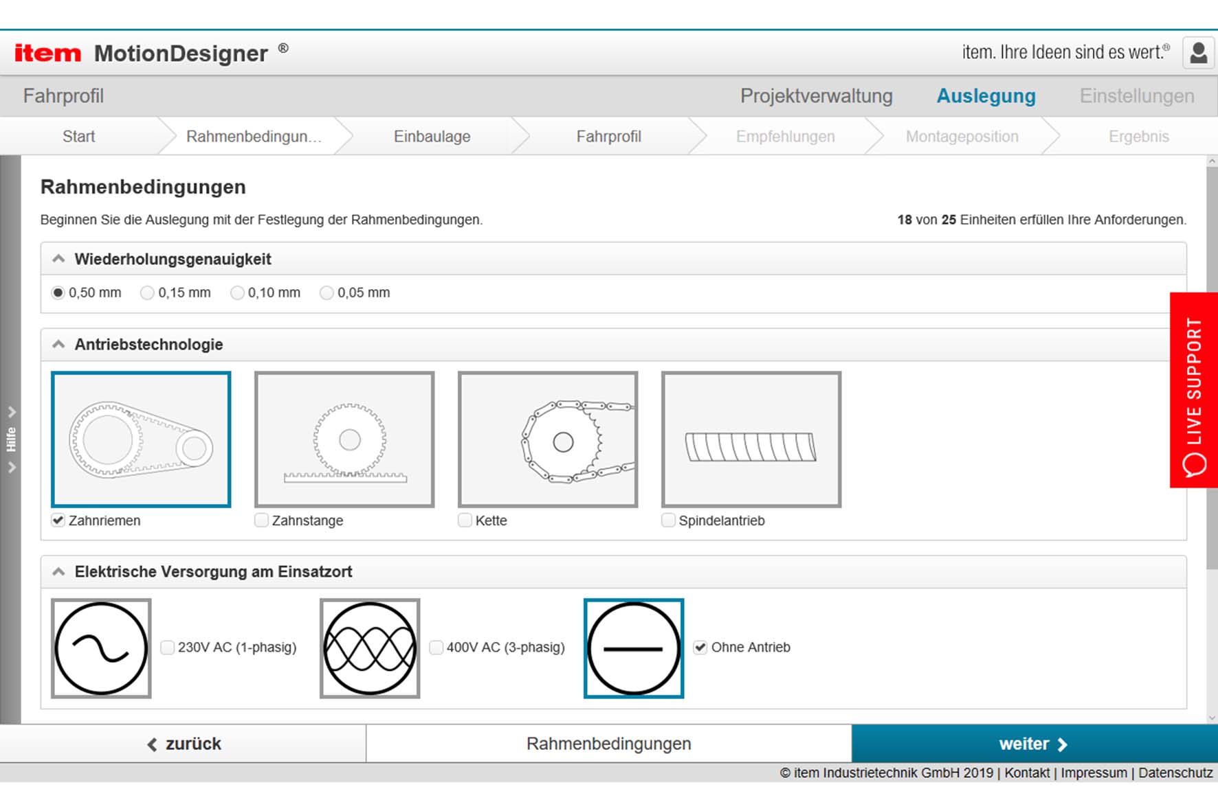 item MotionDesigner® suggests the perfect combination of individual components for a ready-to-install automation solution. The new version of the online software can even be used when opting for motors and gearboxes from third-party manufacturers. item MotionDesigner® includes universal Drive Sets for this very purpose. The program indicates the required drive power and provides additional data that enables users to connect up perfectly with their drive technology and controllers. Should they need technical support when configuring their Linear Units, users have a direct line of contact with customer advisers from item during standard business hours thanks to the “Live support” function. As the market leader in building kit systems for industrial applications, item has also updated its MotionSoft® commissioning software. The new version both simplifies and speeds up the process of programming motion profiles. Context menus and detailed graphics make the software easier to operate and provide a clearer overview of the individual steps in the profile. Additions and modifications can be made using the convenient drag-and-drop function.