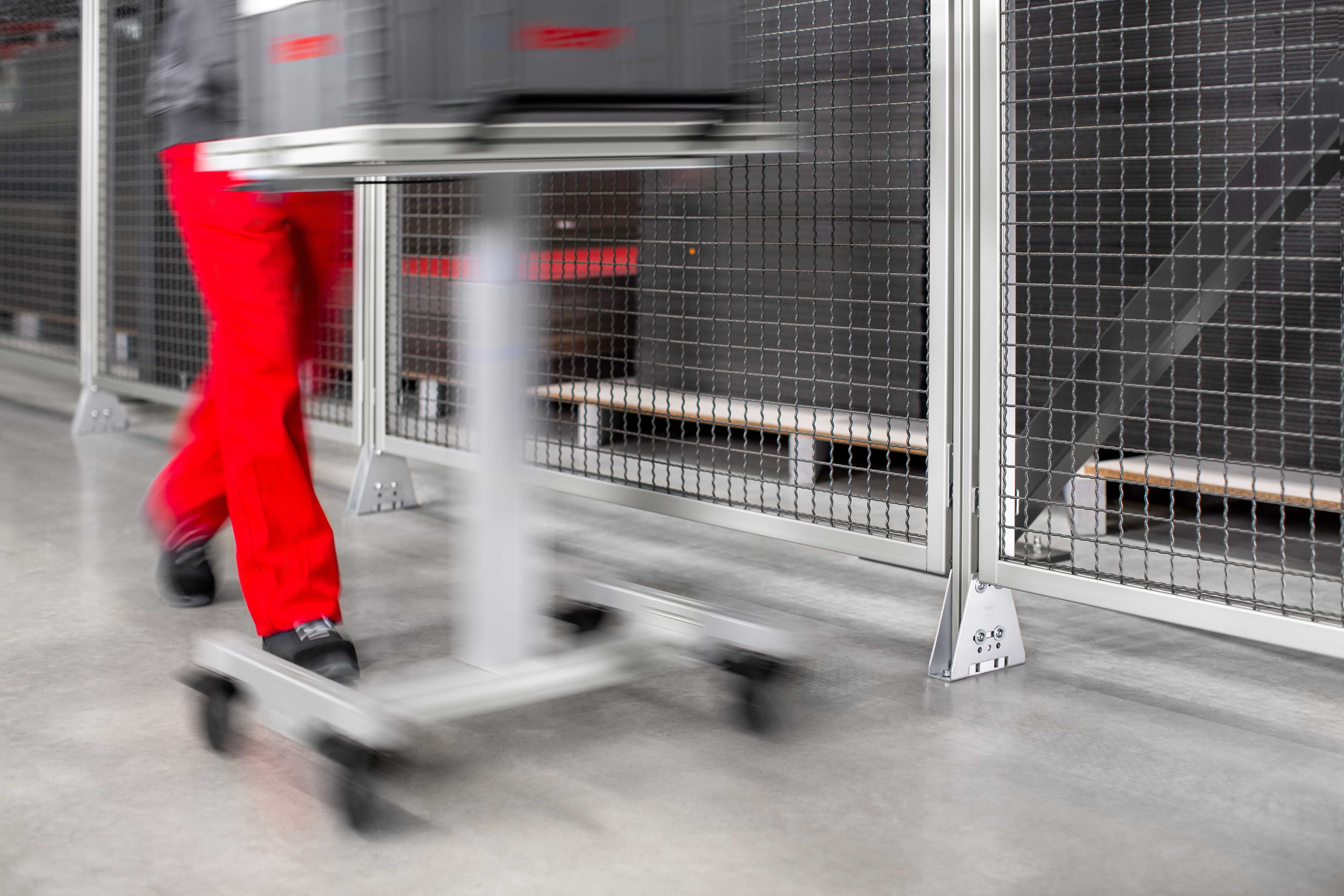 Another new addition that speeds up assembly is Stand Foot Set 8 St 160x160. This is anchored to the ground, provides a strong and secure hold, and takes up minimal space. As a result, free-standing enclosures and guards can now be fastened to the floor in next to time. Profiles 8 80x40 or 8 40x40 are screwed into the profile grooves using the Stand Foot Set. This can be done by creating either a static or dynamic connection. Through holes are used to maintain a rigid, mechanically locked connection. Attaching the profiles via the Stand Foot slot makes it possible for impacts and stresses to the guard to be absorbed. If severe collisions occur, this can be immediately identified by the screw fixings, meaning guards can be checked for damage at a glance.