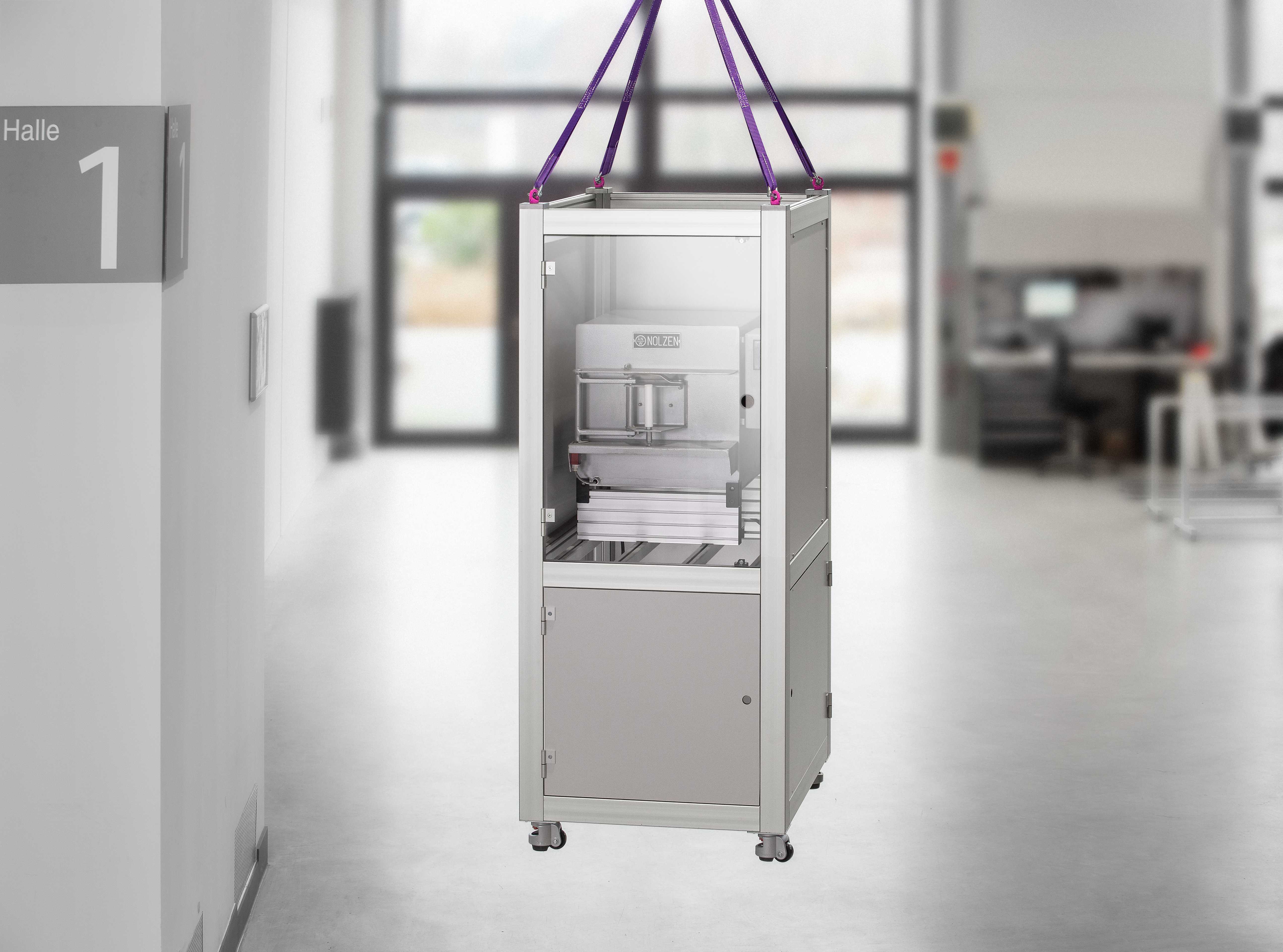 Transport Plate Set 8 80x40 St, M10 and 8 80x80 St, M10 in conjunction with Lifting Point M10, WLL 0.4 t, rotating make it possible to safely transport hanging loads. To do this, the Transport Plates are screwed to the core bores at the end face of Profiles 8 80x40 or 8 80x80. Once the pink Lifting Point has been screw-fastened to thread in the Transport Plates, loads of up to 4,000 N can then be hoisted, and the Lifting Point can still be rotated by up to 360°.