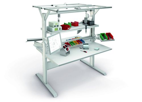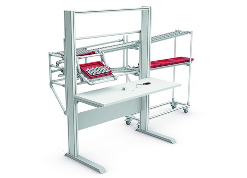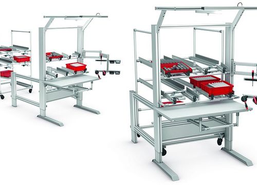 Extrémně stabilní pracovní stůl 4E má nosnost až 400 kg a elektrický systém pro nastavení výšky. Zásobníky ergologistic® s nastavitelným úhlem jsou ideální pro optimální tok materiálu v krabicích, bednách nebo na malých nosičích. Malé díly lze odebírat pomocí kontejnerů a deskových profilů s úchytem, které jsou připevněny přímo k zásobníku. Informace jsou poskytovány prostřednictvím pětikloubového držáku monitoru.